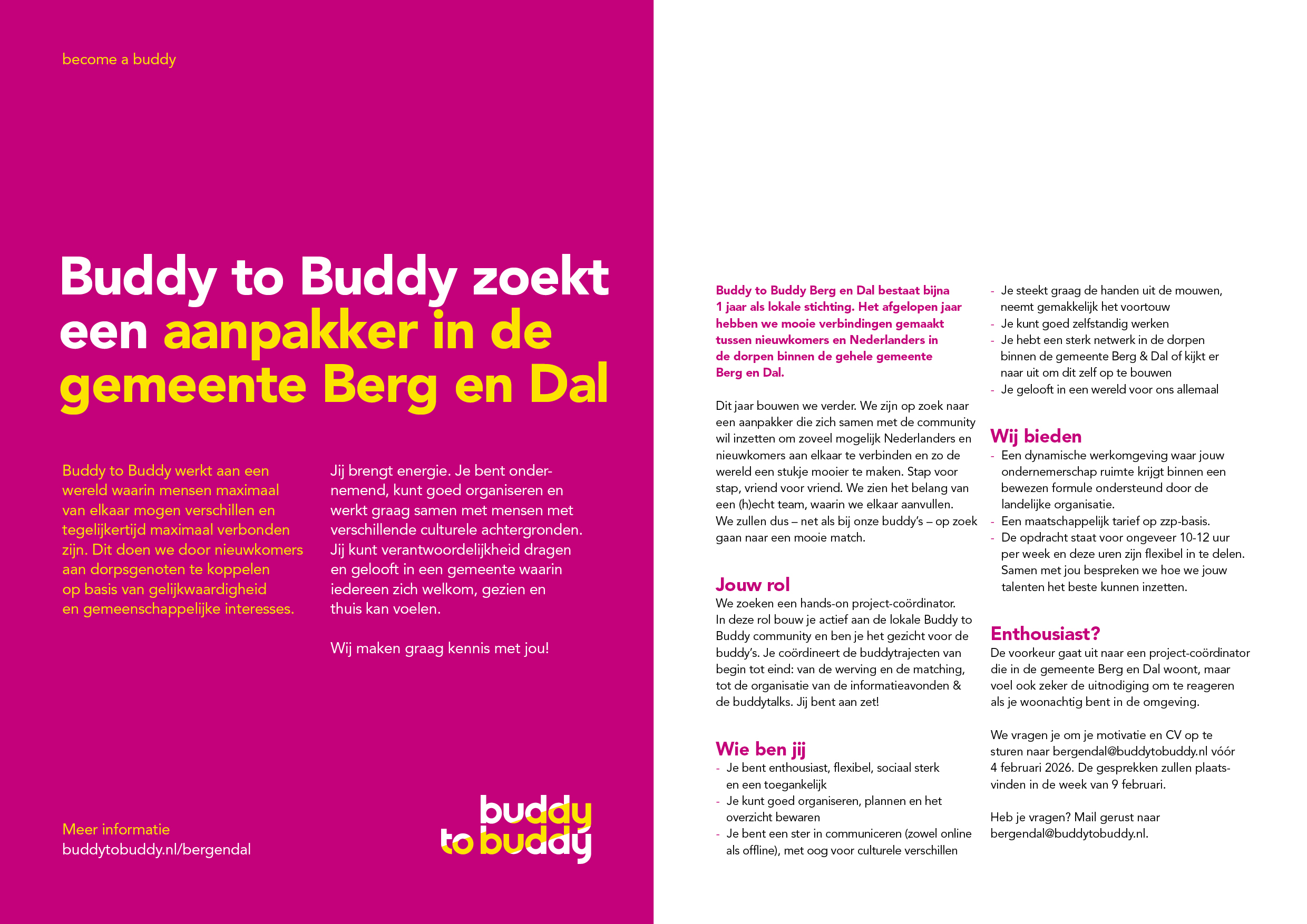Als je na het lezen van deze vacature denkt: “dit ben ik”, vertrouw dan op dat gevoel en solliciteer. Vertel ons jouw motivatie in een brief of een filmpje, net wat jij fijn vindt en stuur deze samen met je cv naar bergendal@buddytobuddy.nl