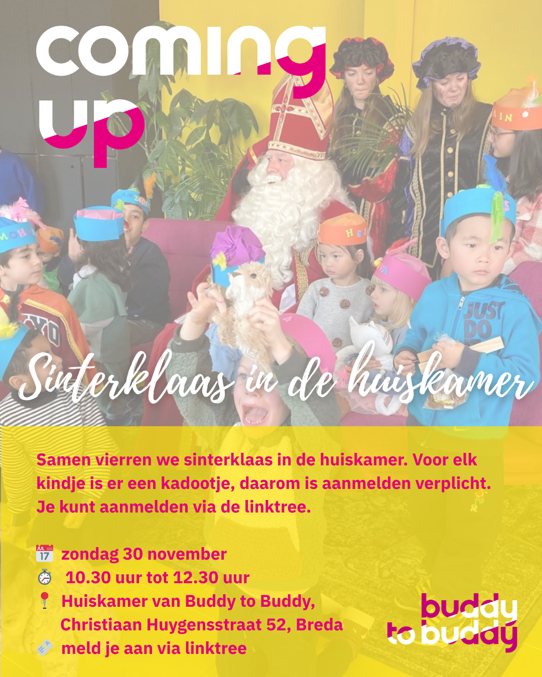 Op 30 november komt sinterklaas een bezoekje brengen aan de Huiskamer van Buddy to Buddy. Een feest met kadootjes, pepernoten en gezelligheid. Zijn jullie er bij? Het Sinterklaas feest is van 10.30 tot 12.30. In verband met de kadootjes voor de kinderen is het belangrijk dat jullie je hier voor aanmelden. Het is voor kinderen tot 10 jaar. Graag voor 7 november. Voor vragen kun je appen naar Marielle Frijters, 06-42433788.